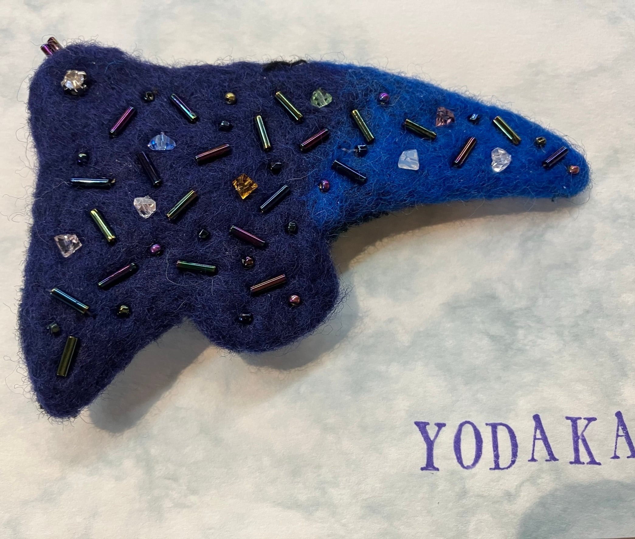 宮沢賢治作品の『よだかの星』をモチーフにした羊毛フェルトのブローチです。 裏は革張りとなっております。 サイズ:(約)たて6.5cm×よこ10cm 販売者:どんぐりーず