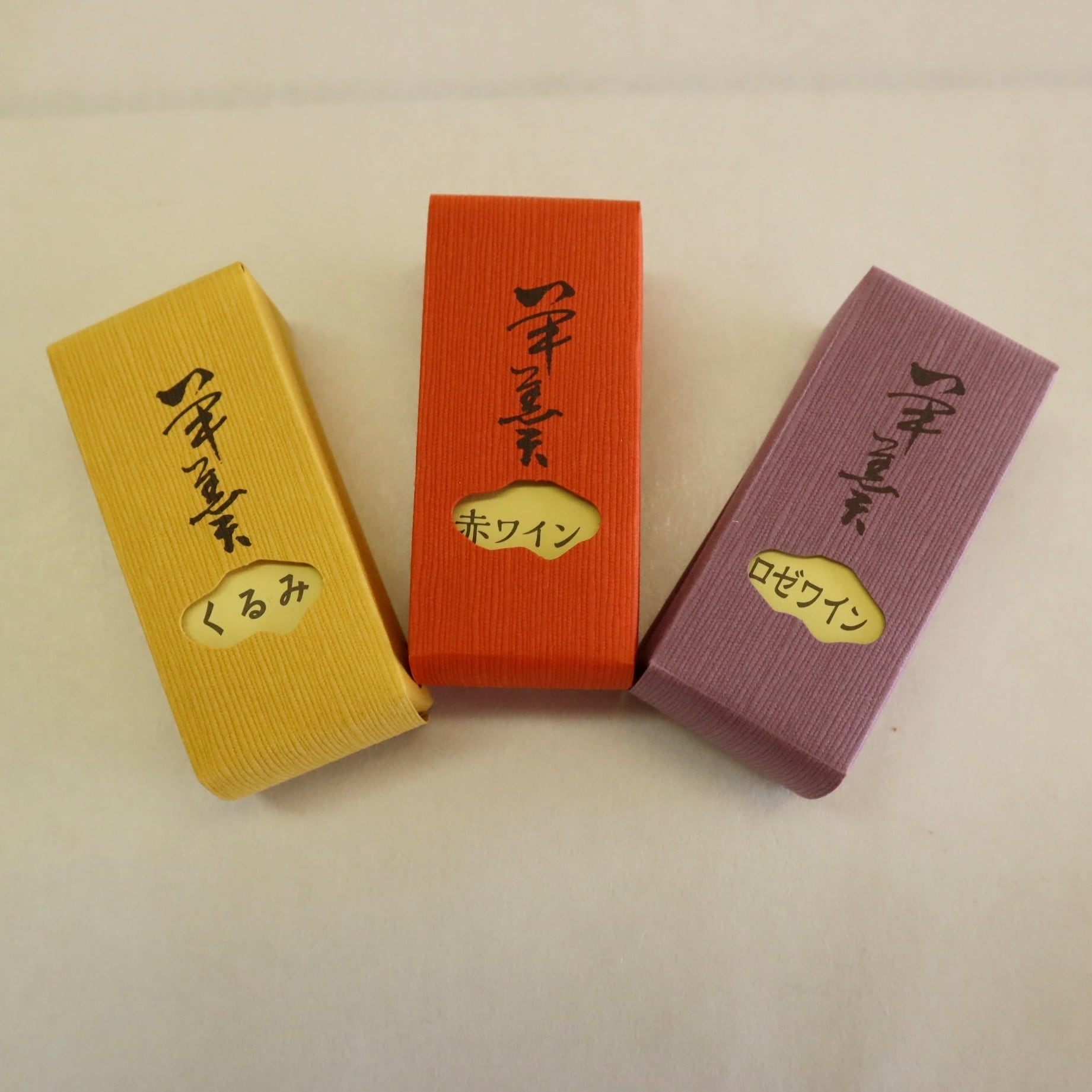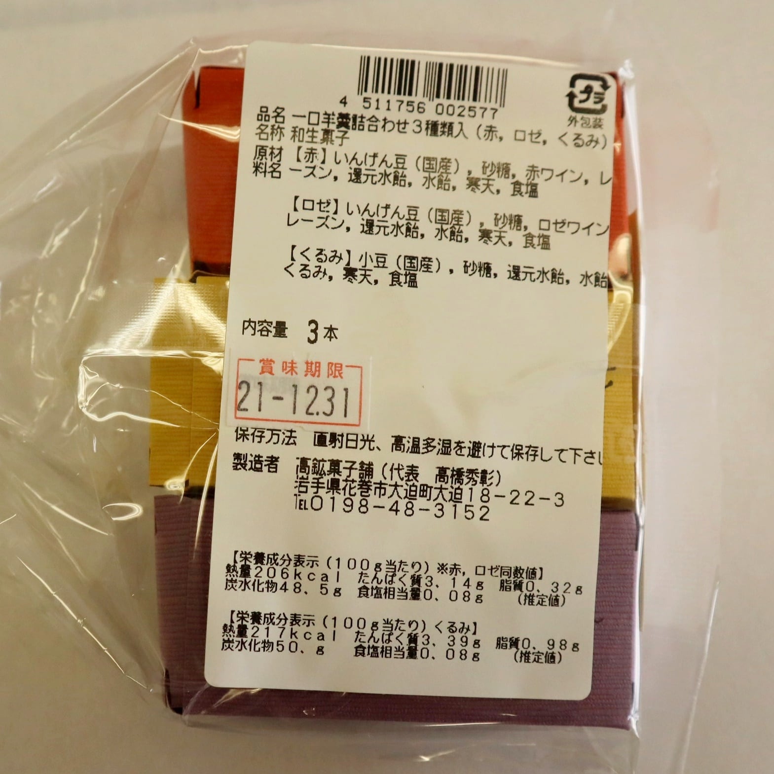 花巻大迫産エーデルワインを使用した羊羹2種とくるみ羊羹の3本入り。 エーデルワインのほのかな香りと上品な甘さ、くるみの香ばしい味をお楽しみください。 一口サイズが食べやすい! 内容量:70g × 3個 販売者:高鉱菓子舗