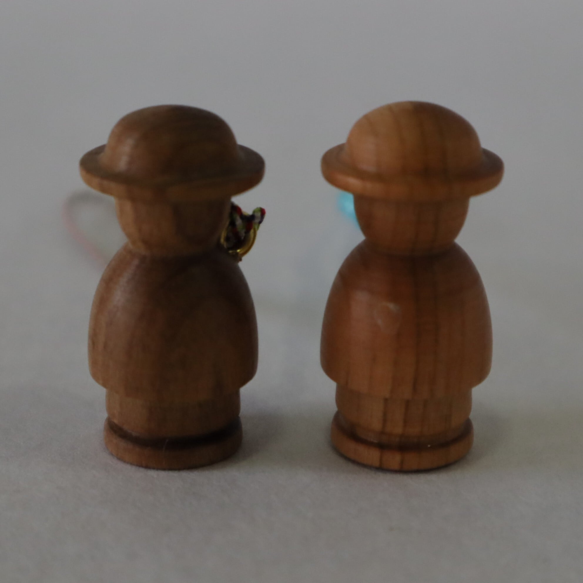 宮沢賢治をモチーフにした「「デクノボーこけし」を根付にしたものです。岩手の山々に育まれた木々を素材に造られており、木々の種類により木肌の違いがあります。 小物につけて賢治の世界を想い描いて楽しんで頂ければ幸いです。 ※木材の種類は「桜」「欅」「山梨」「槐」4種類 種類についてはおまかせとなります。 サイズ:本体 3.5cm ひも 8cm 販売者:煤孫こけし