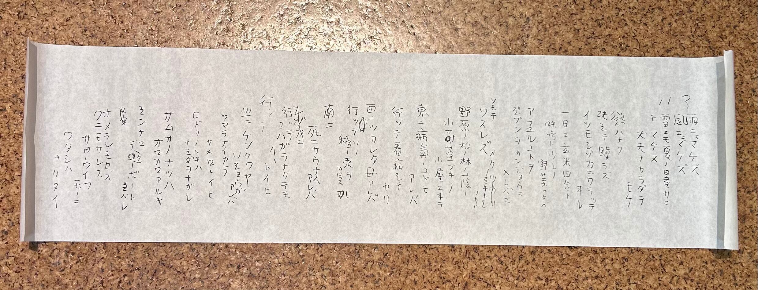宮澤賢治没後、愛用のトランクから発見された手帳。中には、南無妙法蓮華経のお題目と一緒に、「雨ニモマケズ」が書いてありました。そのまま一枚の和紙に抜き出した巻紙です。 縦192mm×横698mm 箱入り 販売先:(株)風童社